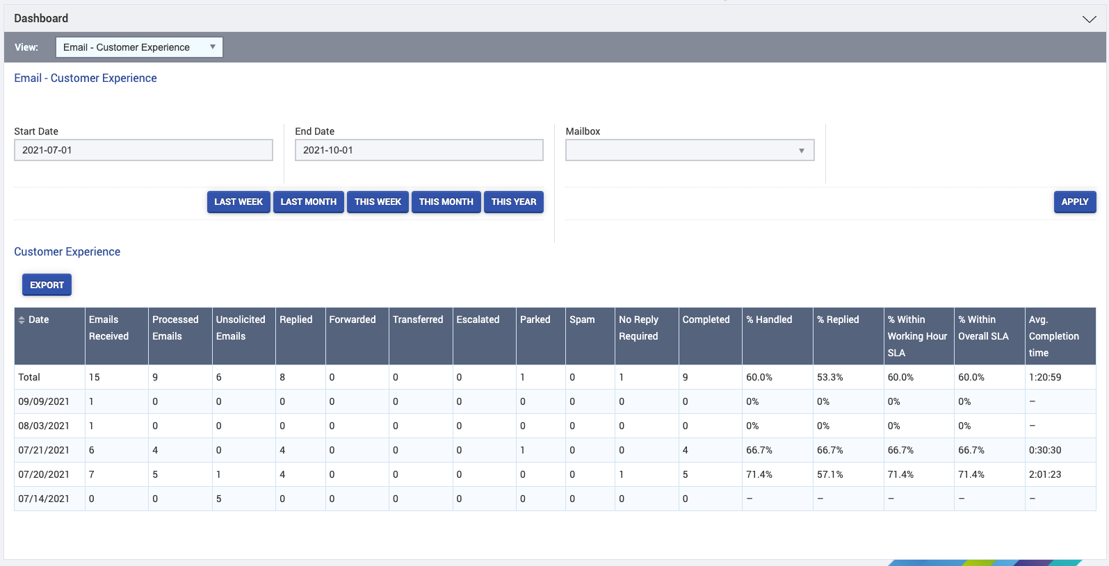 The Email by Customer Experience report tells you the number of customer emails that were received on a given date and how they were processed.