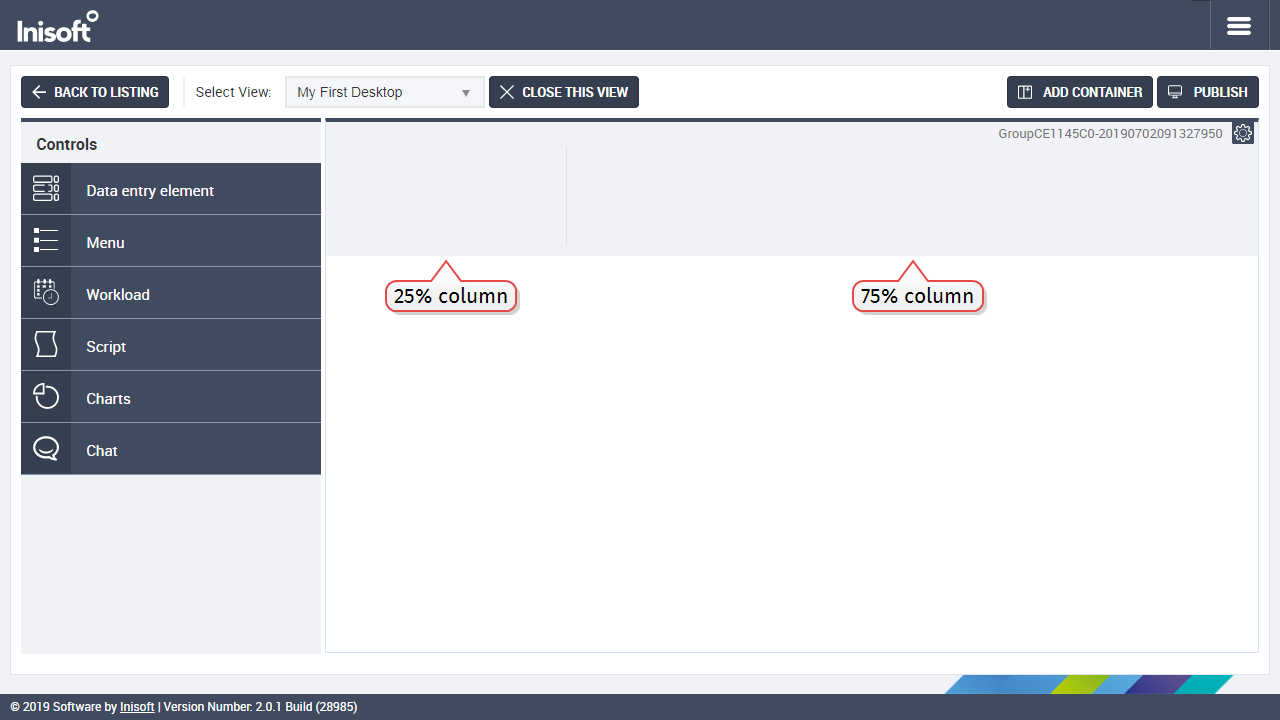 A two-column container is added to your desktop. The left-hand column of this container will take up a quarter of the horizontal space on the agent’s desktop, while the right-hand column will take up three-quarters of the space.