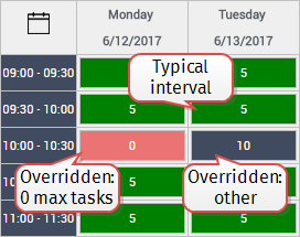 The weekly pattern defines the interval configuration for a typical week. You can, however, override specific intervals a time slot to which agents can assign tasks on specific days.
